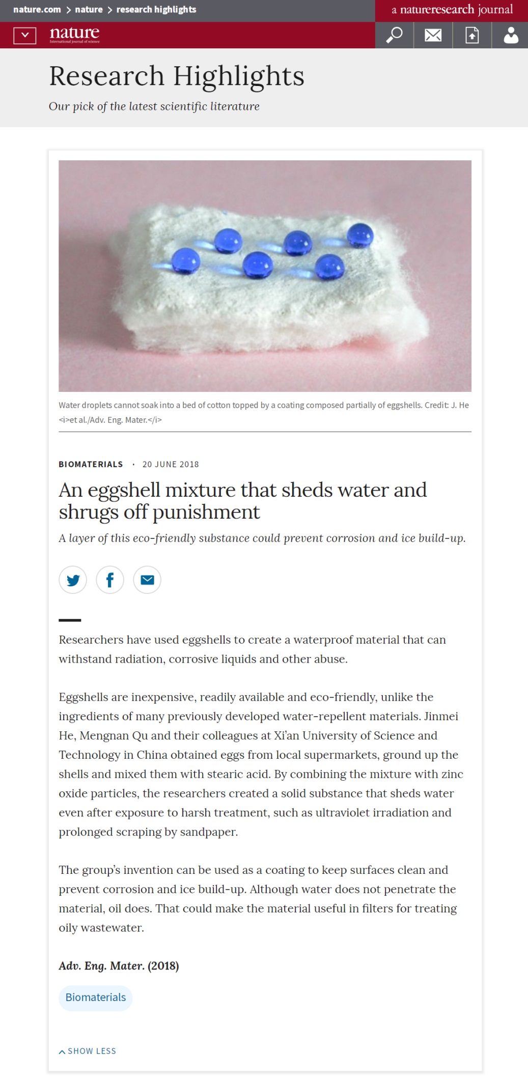 Nature Research Highlights评价该方法不仅具有原材料廉价、制备方法简便等优点,更重要的是利用了生活中废弃的鸡蛋壳这一生物质材料,使得该超疏水材料不同于之前所报道的大多数斥水材料,其组成对环境非常友好,同时具有很好的机械耐久性和化学稳定性,可适用于苛刻环境。该材料应用前景广阔,可用于自清洁、防腐蚀、防冰涂层,以及分离过滤含油废水等。