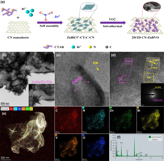 图1 (a) 2D/2D CN-ZnBVO异质结合成过程示意图; (b) CN-ZnBVO异质结的HRTEM图和 (e, f) 相应的元素映射图.