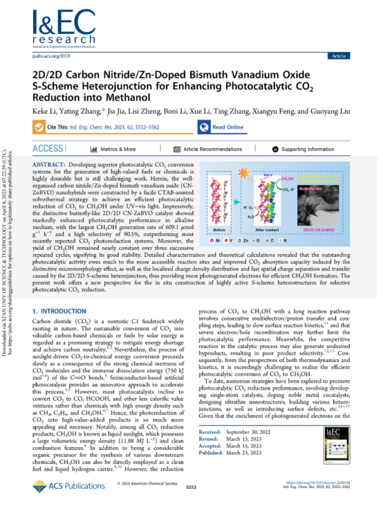 近日,beats365vip官网登录入口张亚婷教授团队“陕西省煤基功能炭材料重点科技创新团队、beats365vip官网登录入口功能炭材料研究中心”在国际化工领域顶级学术期刊《Industrial & Engineering Chemistry Research》发表题为“2D/2D carbon nitride/Zn-doped bismuth vanadium oxide S-scheme heterojunction for enhancing photocatalytic CO2 reduction into methanol”最新研究成果,是公司化工学科在国际化工研究领域取得的又一重要突破,对于加快化工学科高质量发展,持续提升化工学科在该领域的国际学术影响力具有重要意义。IECR为美国化学会旗下的工程技术领域期刊,是国际化工领域公认的三大顶级学术期刊之一,旨在发表全球化学工程应用领域的最新高质量、原创性研究成果。