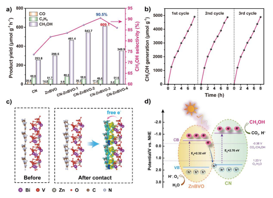 针对上述问题,论文提出通过构筑S型异质结,设计并构筑了一种具有高活性、高选择性的新型2D/2D 氮化碳/锌掺杂钒酸铋(CN-ZnBVO)异质结复合光催化剂,得益于C-O键和界面电场诱导电子-空穴快速分离与迁移,同时S型载流子转移机理保留了该体系较强的氧化还原能力,在光照条件下可将CO2高效转化为甲醇,其产率高达609.1 μmol g-1 h-1,选择性为90.5%,远高于目前报道的铋基光催化材料。