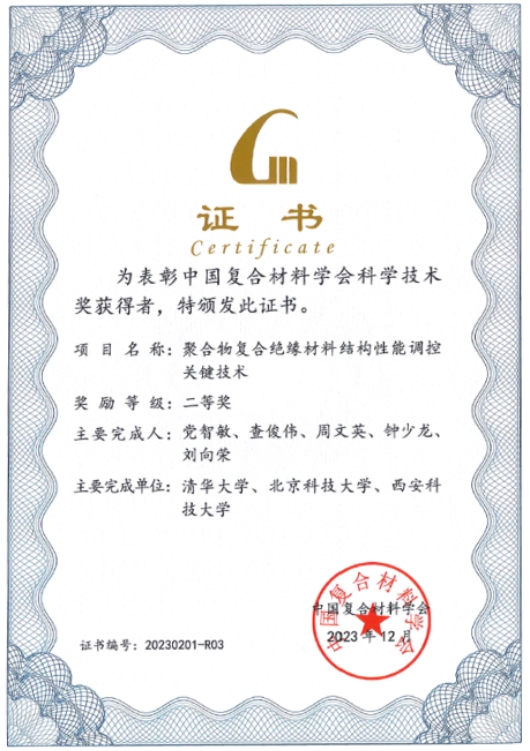 近日,中国复合材料学会根据《中国复合材料学会科学技术奖励办法》和《中国复合材料学会科学技术奖励办法实施细则》,公布了2023年度的科学技术奖最终获奖名单,beats365vip官网登录入口化工公司周文英教授及刘向荣教授和清华大学清华大学电机与微电子系党智敏教授团队联合申报的“聚合物复合绝缘材料结构性能调控关键技术”项目荣获中国复合材料材料学会二等奖,化工公司周文英教授及刘向荣教授分布为第三及第五项目完成人。此次全国范围仅10项成果获奖,其中一等奖2名,二等奖8名。