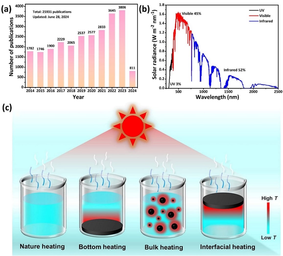 图1. (a)使用关键词“界面蒸发”对近十年发表的文章数据进行统计分析(数据来源:Web of Science)。(b)太阳光谱辐照度。(c)太阳能蒸汽发生的不同加热方式。