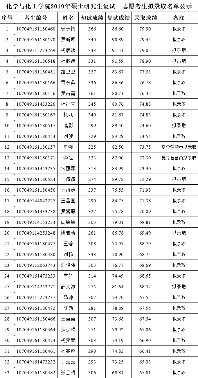 2019年硕士研究生复试一志愿考生拟录取名单公示