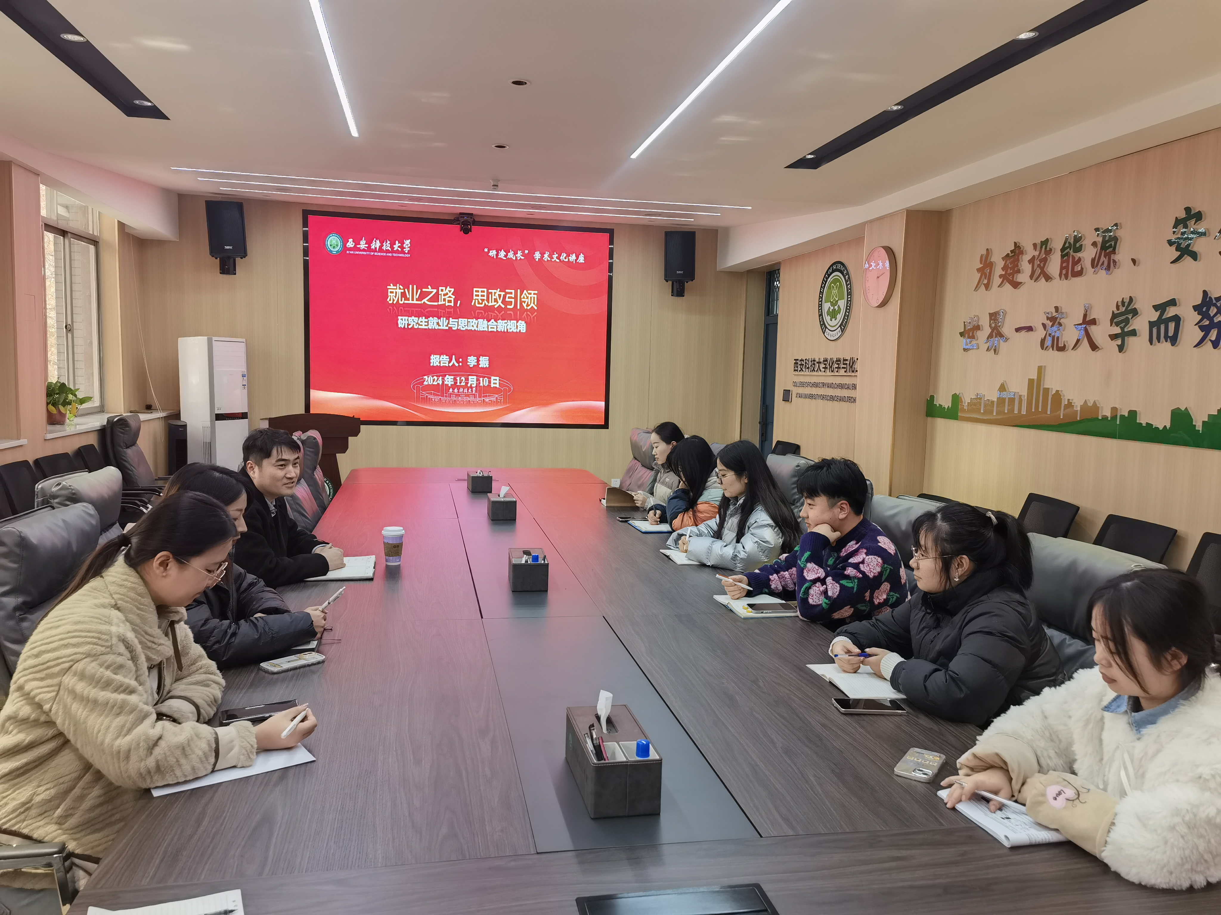 12月10日,由研工部主办、化工公司承办的“沿途成长—导学思政沙龙”活动在雁塔校区4号教学楼512会议室举办,由化工公司副经理李振教授担任主讲人。本次活动以“就业之路,思政引航——研究生就业与思政融合新视角”为主题,旨在通过就业、创业新视角发挥研究生的创造力与社会价值。通过思政教育引导研究生在选择就业时,坚守职业道德,恪守诚实守信的原则,勇敢承担起社会责任,做一个具有担当精神的新时代青年人才。