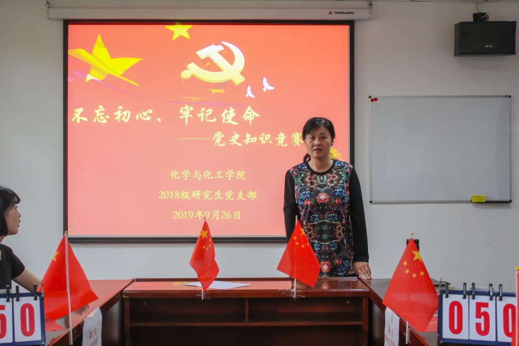 9月26日下午,化工公司2018级研究生党支部在雁塔校区举办了“不忘初心、牢记使命”党史知识竞赛。公司党委副书记杨宝华老师、2018级所有党员和积极分子参加了本次活动。