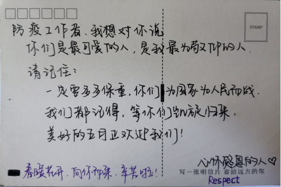 化工公司宣传部组织同学们开展“绽放战疫青春·坚定制度自信——书画大赛”、“防疫工作者,我想对你说”卡片征集活动。鼓励同学们用书画传承爱国主义精神,用诗情画意表达出对抗疫工作者们的敬佩,对向抗疫工作者们致敬。或采用电子卡片、手写卡片等方式,在卡片上写入想对抗疫工作者说的话,向防疫工作者传递心中的感激与关怀,我手写我心,传递光和热。