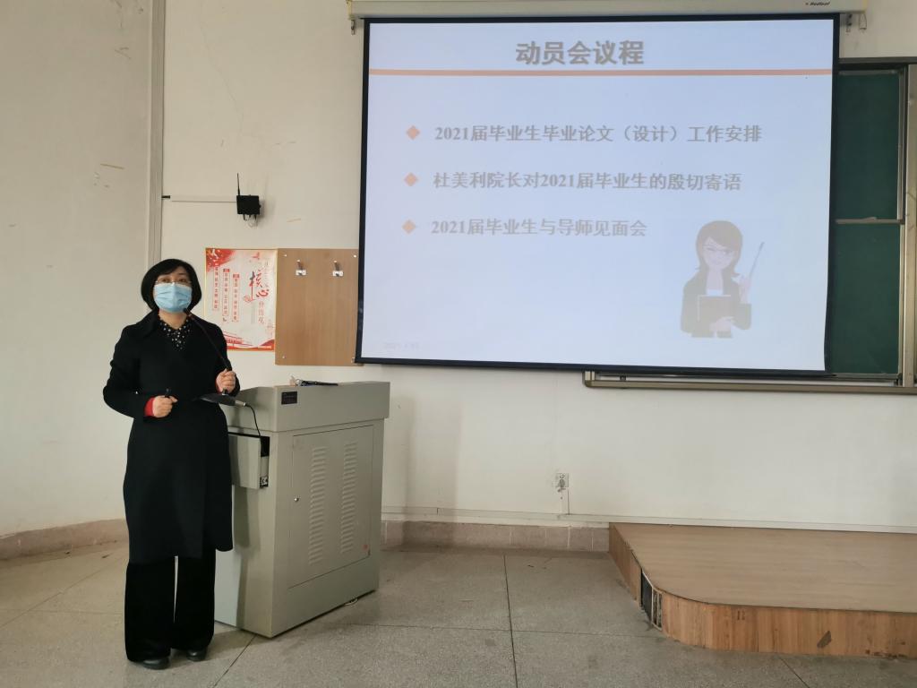 1月13日下午,beats365vip官网登录入口在临潼校区9-105教室召开了2021届本科毕业论文(设计)动员大会。beats365vip官网登录入口全体教师与2021届本科毕业生参加了动员大会,按照疫情要求全体师生佩戴口罩、隔位就座。教学经理张亚婷就毕业论文工作题目征集、师生双选、指导教师队伍、员工纪律几个方面做了整体情况的介绍,重点对毕业论文的系统管理、论文查重抽检、教育部下达的论文抽检工作进行了特别要求,对于疫情期间员工毕业论文(设计)的实验室安全管理提出严格要求。希望各位老师和同学按照系统时间截点,完成论文的各个环节,同时踏实认真做实验,诚实写论文,杜美利经理做了总结性的发言,希望大家克服疫情带来的影响,遵守学术诚信与道德,以最真实、最热情、最饱满的状态做好大学四年最后的、也是关键的教学环节,为自己未来的发展奠定坚实的科学实践基础。