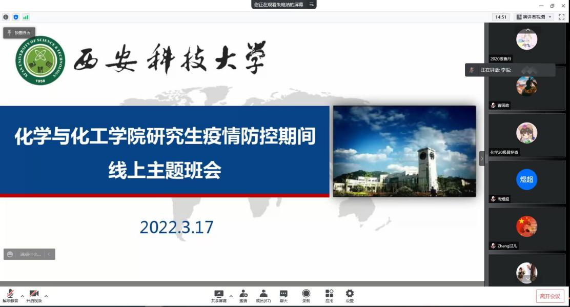 3月17日晚,化工公司按照研究生不同年级的学业阶段特点,分别召开了以疫情防控和学业科研规划为主题的线上班会。特别邀请邓军副董事长参加,班会由李振副经理主持,经理张亚婷、党委副书记杨宝华、研究生辅导员及全体研究生参加了会议。