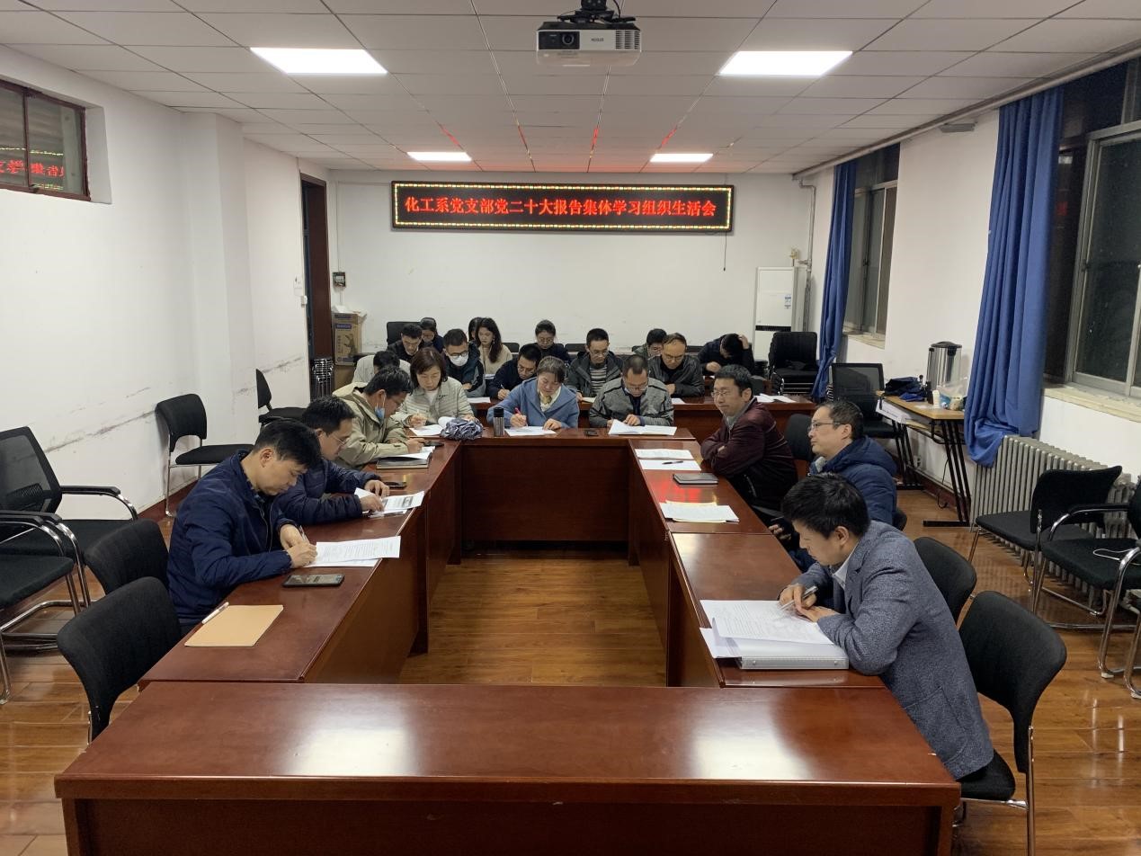 中国共产党第二十次全国代表大会召开以来,化工系支部全体党员除2022年10月16日上午观看开幕式的盛况,仔细聆听习近平总书记所做的报告并学习讨论外,支部党员也在以手机、电脑、纸质报告等多种方式进行自学。同时为了更好领会党的二十大报告的会议内容和精神内涵,2022年11月11日晚7:00,化工系党支部在校雁塔校区公司会议室召开专题会议,再次进行学习贯彻党的二十大精神,会议由化工系支部书记章结兵主持。