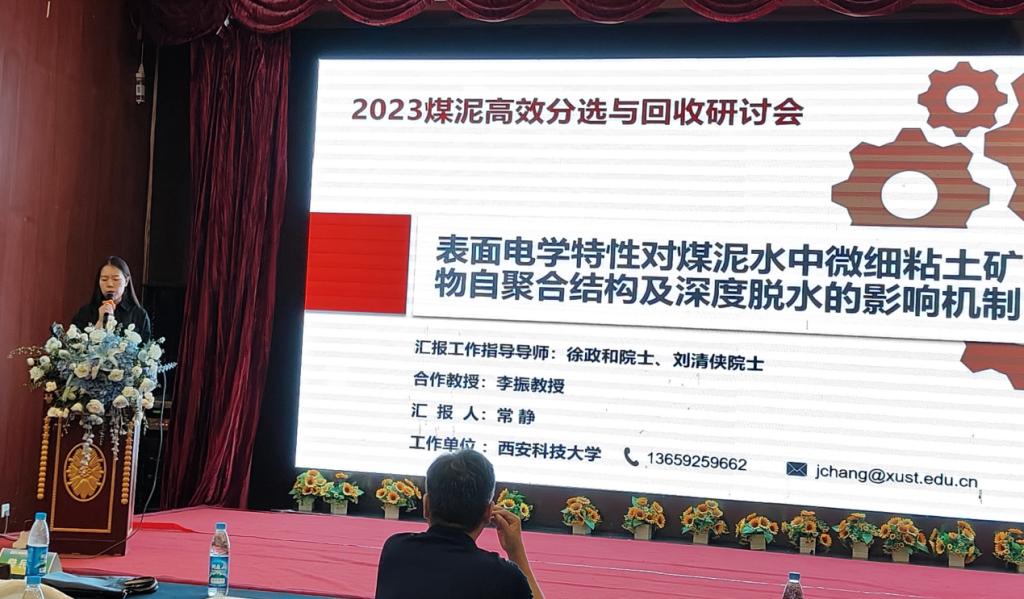 会上,中国煤炭工业协会理事长、中国煤炭工业协会选煤分会会长张绍强作了题为“加强煤炭清洁、高效、低碳化利用,推进我国煤炭洗选加工产业健康发展,提升煤泥处理水平”的年度主旨报告、张怀青博士代李振教授作了题为“西部高惰质组煤显微组分干法分质纯化技术研究”的报告,矿物加工工程系常静副主任向与会专家和学者介绍了“表面电学特性对煤泥水中微细粘土矿物自聚合结构及深度脱水的影响机制”。