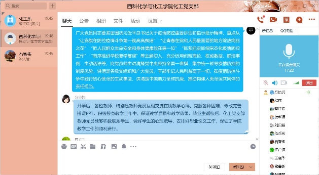 2020年6月29日19时30分,化工支部在线召开了组织生活会,支部组织生活会的主题是“迎党的生日、讲战疫故事、悟初心使命”,在这次组织生活会中,各个党员同志分享了疫情期间自己所见、所闻、所感的人和事,有很多优秀共产党员的言行感染着他们,他们将其分享给支部同志,讲述他们的感人事迹。在我们身边也有这样的故事,张亚婷同志叙述在开学后,各位教师,特别是教师党员互相交流在线教学心得,克服各种困难,修改完善授课PPT,积极投身教学工作中,保证教学质量和教学效果。毕业生返校后,化工党支部教师党员能够积极联系员工,做好员工的心理疏导,安排好毕业论文工作,保证了公司教学工作的顺利进行。章结兵同志讲述了开学后,化工系很多教工自觉行动起来,废寝忘食学习在线教学新技术,互相交流学习心得,他们秉承的目标就一个,做到线上教学不打折扣,通过努力,圆满完成这学期的教学任务,在毕业生不能到校的前提下,化工系教工尽量利用一切现代化手段与员工建立联系,及时跟踪毕业设计的进度,保证了毕业论文的质量,同时在疫情较严重的阶段,很多同志不怕疫情风险,面对面无私指导、帮助青年教工修改基金本子,提质基金撰写质量,这些身边鲜活的实例都是大家学习的榜样,是不忘初心、勇担使命的代表。在这次组织生活会中,通过这些感人事迹的分享,化工系党员同志再次感悟了初心使命,净化了心灵,提升了党员同志的理想信念,在今后的工作中,大家纷纷表态,像陈治平同志所感一样,作为一名工作在教师岗位上的党员,更应该不忘初心、牢记使命,努力做一名员工喜爱的好老师,传授知识的同时,融入思想道德教育,使员工学好知识的同时,树立正确的人生观、价值观和爱国观念。