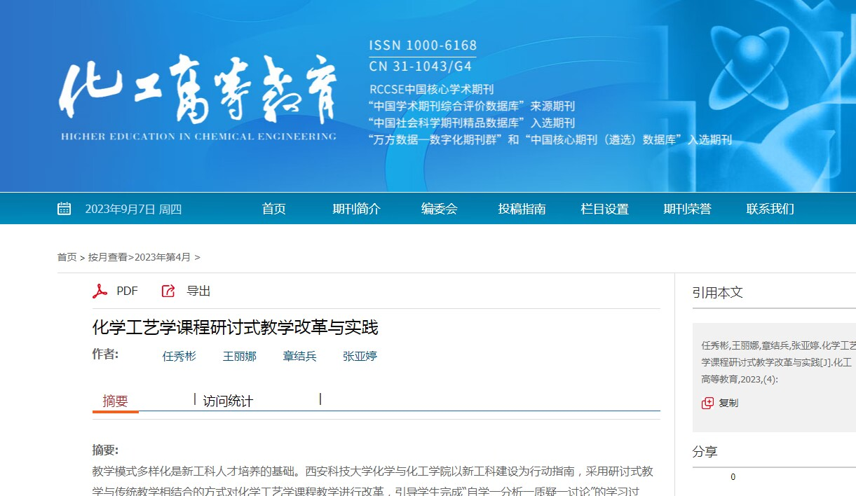 据悉,《化工高等教育》是由教育部主管、华东理工大学主办的教育类学术性核心期刊,是中国化工教育协会会刊,在化工领域具有极高的影响力。